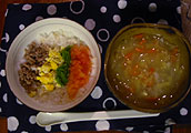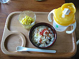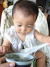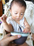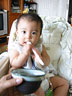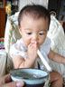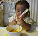もうおかゆでは飽きたらず、大人の白米を要求するようになってきました。食べるカトラリーにもこだわりがあり、離乳食用スプーンでは嫌がり、大人が食べているお箸で食べたがります。どうやら仲間はずれがイヤなようです。 スプーンも自分で持ちたがるようになり、食器にスプーンを突っ込んでは楽しそうにこね回しています。まだ自分では上手にすくえないので、私が手を貸してすくってやります。 |