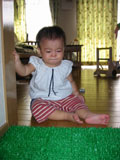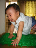 テレビボードで伝い歩きをするようになったので、ビデオを勝手に取り出したり、早送りされたりするようになりました。最初は柵を立てようかと思ったのですが、育児雑誌で人工芝がいいと書いてあったので、百円ショップで買った人工芝を敷いてみました。