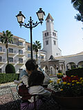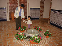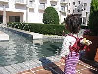 翌朝、朝食後にホテル中庭を散歩しました。ヨーロッパによくある、建物が中庭を囲んでいるという建築なので、広い中庭があります。大小の噴水があり、きれいな花が植わっていました。一応テーマとして、スペインの4地方の特色を表す庭…とパンフレットにあったのですが、私には違いがよくわかりませんでした。