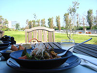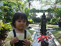 お天気が良かったのと、2歳児がいるということもあって、外のテラスで、夢舞台の噴水とお花を見ながら食べることにしました。