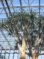 温室の上の青空に、白っぽい緑の葉っぱが映えて、格好良いです。