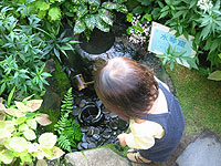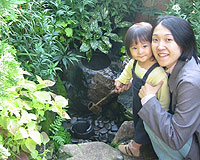 庭の奥には「水琴窟」もありました。ひしゃくで水を穴に流すと、きれいな音が響いてきます。