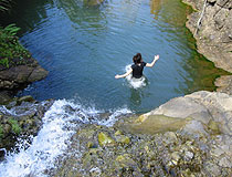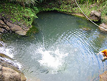 ここで滝壺に飛び込むのが、このコースのメインイベント。 上から水面までの高さは2メートル強。父も私もちょっと尻込みしていましたが、この際、もうしょうがないので、飛び込むことにしました。