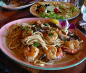麻呂がポークのマンゴソースグリル、私がエビのリングイネを頼みました。ここも一皿17ドルぐらいでした。