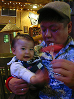 食事中に(たぶん流しの)ハワイミュージシャンが3人来て、各テーブルでハワイアンを演奏してくれました。普段なら、こういうのは遠慮するのですが、ムスメが興味津々で、隣のテーブルに現れた時から、振り返って目を離さない。だからチップを渡して楽しみました。