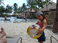 今回はビーチテントを持っていったのですが、どうやら本当は使ってはいけないようです。パラソルならいいみたいで、あとはレンタルの屋根付きビーチチェアがあるのですが、子供たちを日陰に入れておきたい場合には、それでは陰が小さい気がするのですが…。椰子の木をもっと増やすとか、大きなパラソルのレンタルがほしいなぁと思いました。