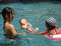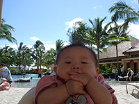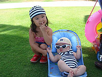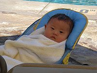 アキラも初めてのプール。最初は水の冷たさにビクッとしながらも、ゆらゆらと揺らしてあげると、ニコニコとご機嫌になりました。