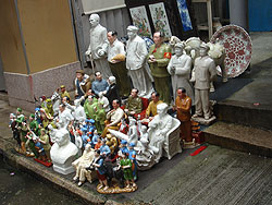(写真)毛沢東グッズがいっぱいです。右下:金魚のついたアンティーク時計です。向こうから猫の置物が狙ってる(笑)