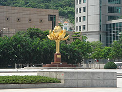 街中に、広い広場があって、ひっそりと大胆に金のハスの花が…。